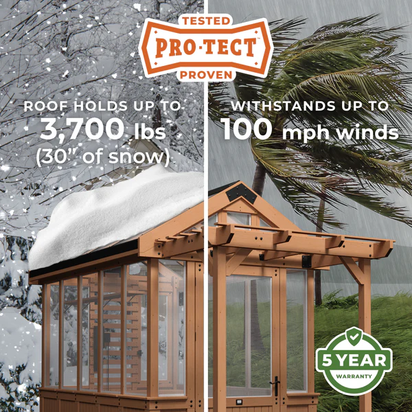 Say goodbye to weather-induced gardening concerns with the Pro-Tect™ Greenhouse. Designed to handle extreme conditions, this remarkable greenhouse is proven to withstand up to 3,700 pounds or 30 inches of snow load, and winds reaching up to 100 mph. Whether you’re dealing with winter storms or summer winds, the Pro-Tect™ Greenhouse ensures your gardening space remains secure and reliable, no matter the season.