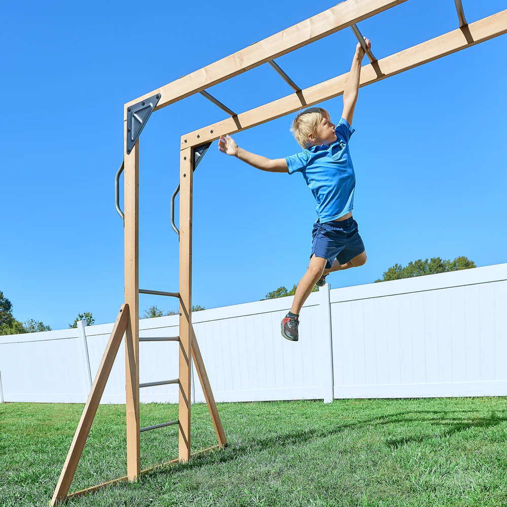 The playset’s versatility adds to the collective experience, featuring two classic belt swings and an innovative trapeze. This ensures multiple children can join in on the fun simultaneously, creating opportunities for shared laughter, camaraderie, and cherished memories. Designed for playtime that grows with your child, this playset is more than just a backyard addition—it’s an investment in joy-filled moments.