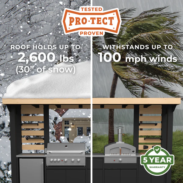 The Fusion Flame 2 Outdoor Kitchen is carefully crafted to meet the needs of every chef. The high-performance grill offers precise temperature control and superior heat distribution, ensuring every meal is cooked to perfection. The built-in pizza oven is a true game-changer, allowing you to craft wood-fired pizzas in no time. To top it all off, the sleek refrigerator provides ample storage for beverages, fresh ingredients, and more. With premium materials used throughout its construction, durability and elegance go hand-in-hand.