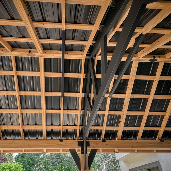 The Pro-Tect™ outdoor structure features a 29-gauge black powder-coated galvanized steel roof, meticulously designed for enhanced dent and corrosion resistance. Beyond its tough steel roof, this structure boasts 100% cedar wood construction, renowned for exceptional strength and natural resistance to decay. The oversized 6×6 cedar beams and reinforced posts ensure stability, strength, and a bold aesthetic appeal that stands out in any outdoor space.