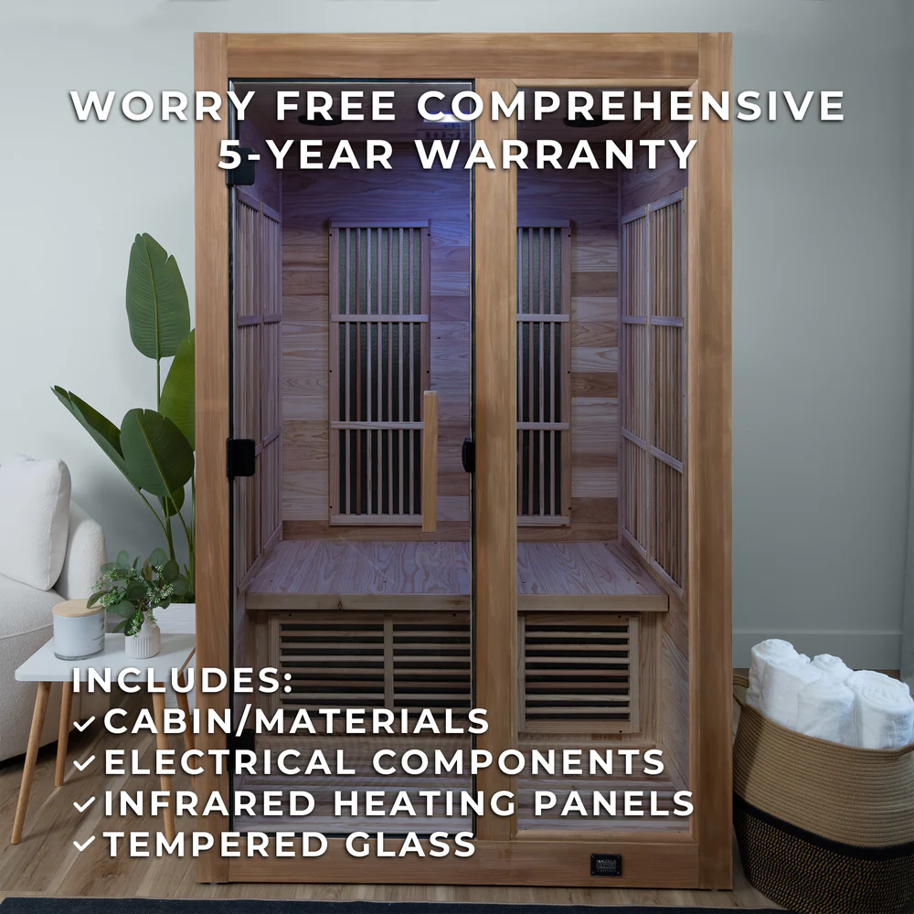 Crafted to perfection, the Rylan is built with sustainability and durability in mind. Our double-wall construction features cedar that is 33% thicker than traditional saunas, ensuring superior heat retention and lasting quality. The 8mm tempered glass door further locks in warmth, maintaining a consistently comfortable temperature throughout every session. Whether you’re relaxing after a workout or seeking health benefits, the Rylan delivers seamless, even heat distribution from start to finish.